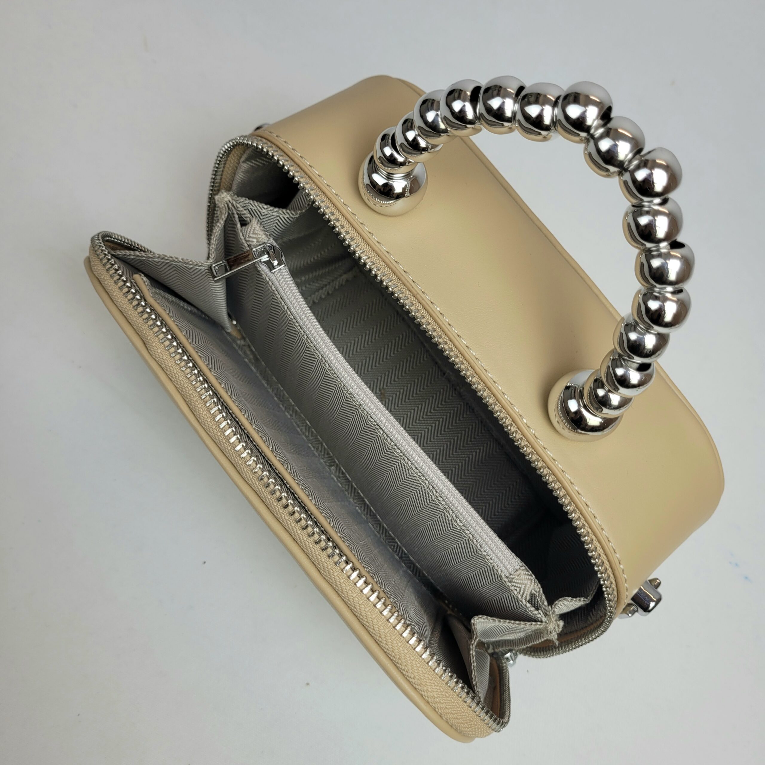 Uma bolsa pequena, com um design arredondado e elegante, destacando uma charmosa alça de mão prateada que adiciona sofisticação ao visual. Para garantir mais versatilidade, ela também possui uma alça removível e ajustável, para diferentes estilos de uso. Apesar de seu tamanho compacto, oferece um bom espaço interno com divisões organizadas e fechamento em zíper. Ideal para carregar seus itens essenciais com muito estilo.