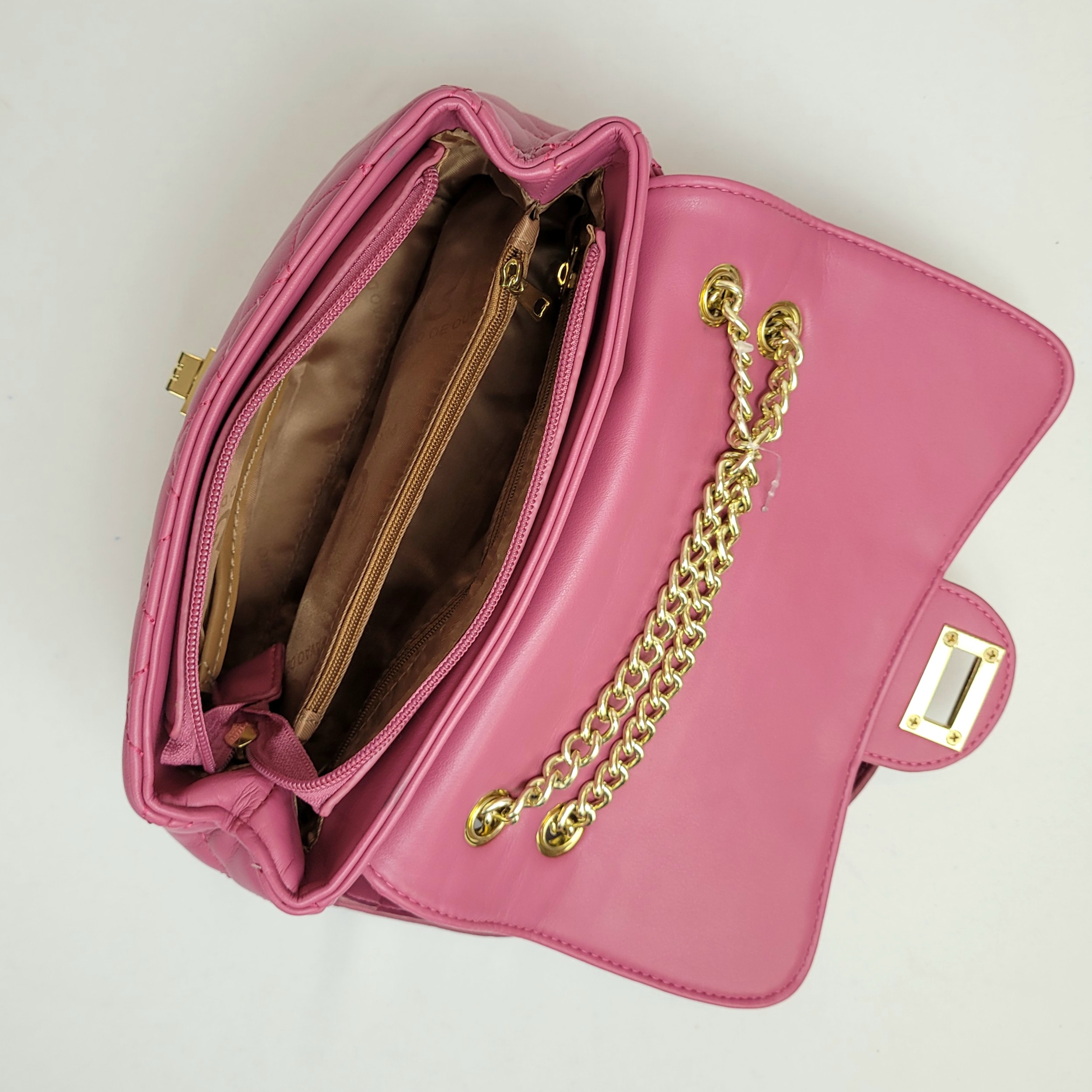 Uma bolsa que une funcionalidade e sofisticação. Suas alças com detalhes em correntes e seu fechamento dourado dão um charme a mais para peça. Além disso, possui um design moderno e elegante. Seu interior é dividido para garantir a melhor distribuição dos seus objetos. Essa bolsa é o toque final ideal para compor produções com charme e praticidade.