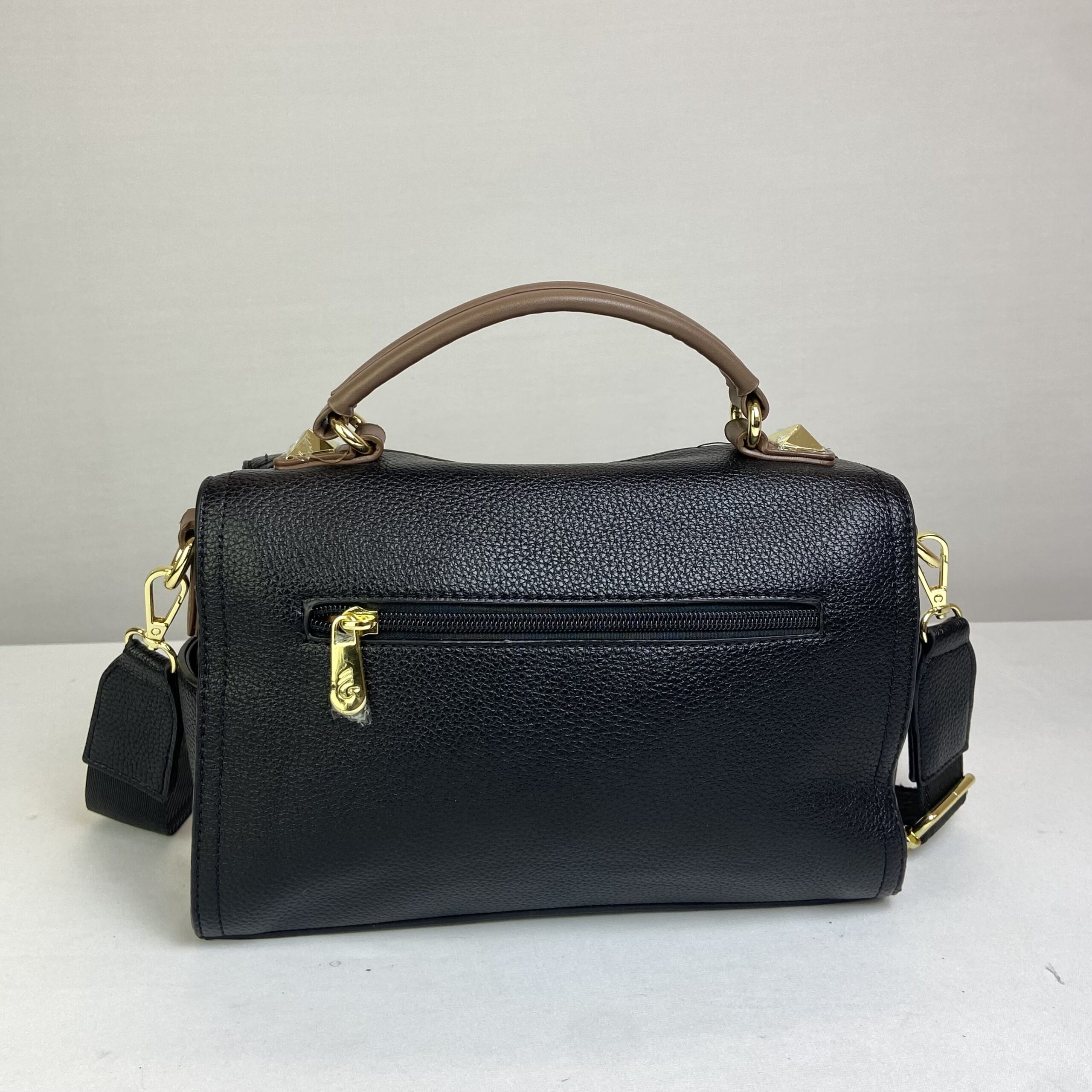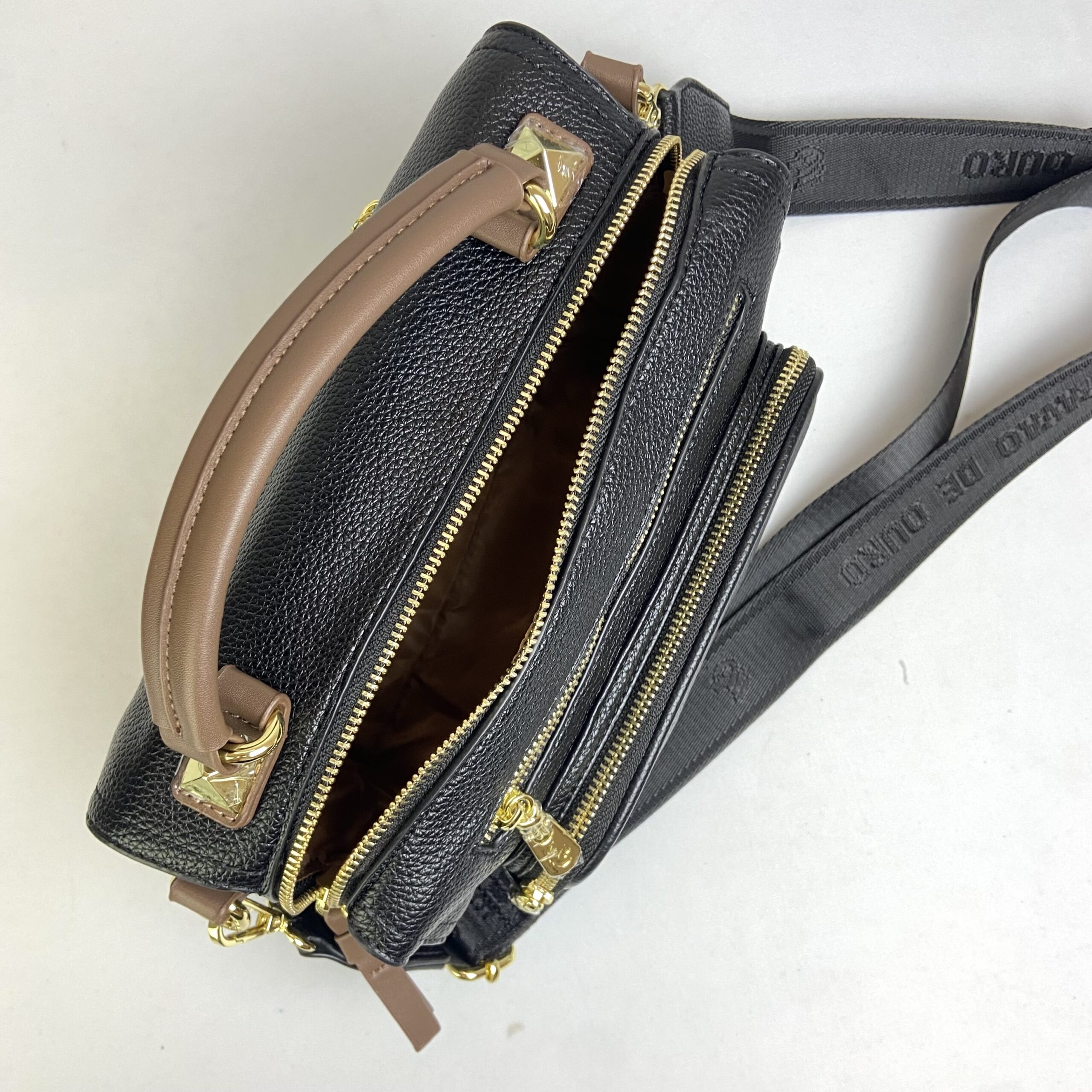 Bolsa preta com design moderno e acabamento sofisticado, realçado pelos fechamentos dourados e detalhes em marrom. Perfeita para quem busca sofisticação e praticidade. Conta com um amplo espaço interno, organizado com dois bolsos na parte da frente e um na parte de trás, garantindo praticidade e fácil acesso aos seus pertences. Além disso, dispõe de alça de mão e alça removível e ajustável em nylon, proporcionando versatilidade para diferentes ocasiões. Uma escolha elegante para complementar qualquer look com estilo e funcionalidade.