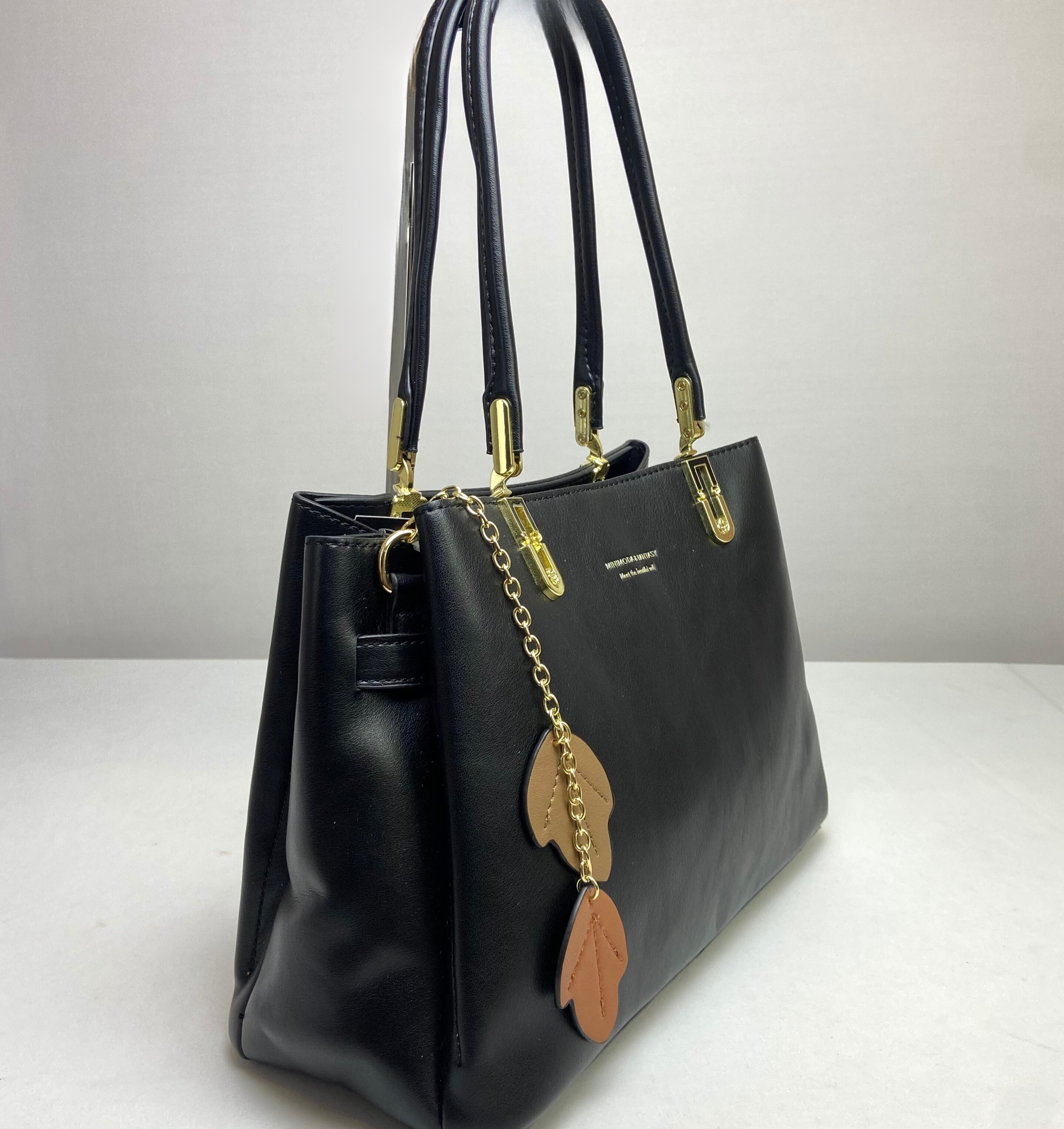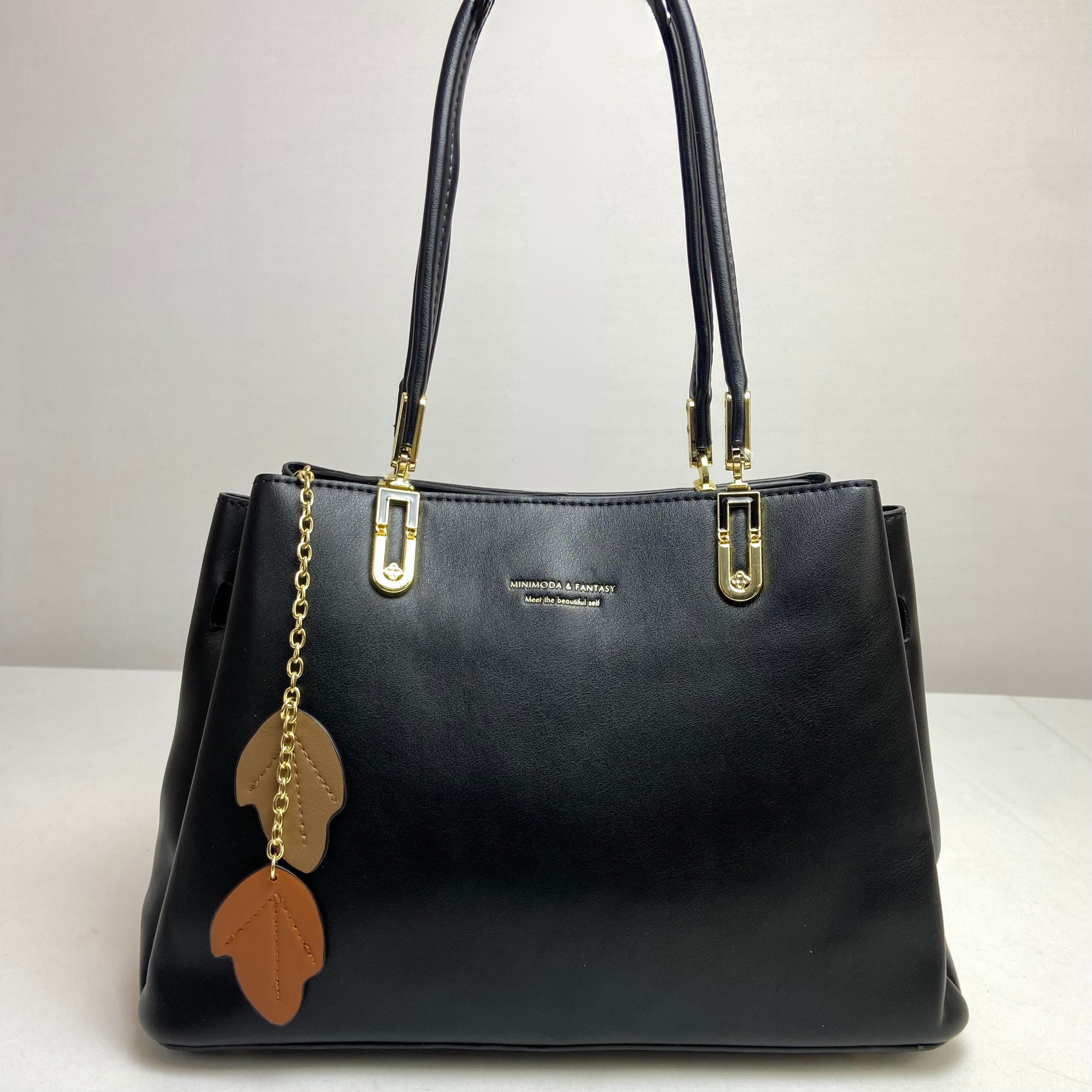 Bolsa preta com design sofisticado e clássico, ideal para quem quer elegância e funcionalidade. Espaçosa e bem estruturada, conta com uma alça de ombro confortável para uso diário. Seu espaço interno possui repartições estratégicas para melhor organização, além de um charmoso chaveiro de folhas que adiciona um toque especial ao design.