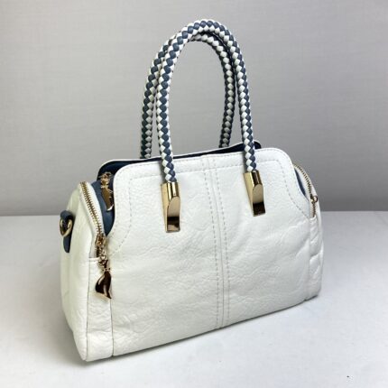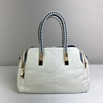 Bolsa off-white elegante com design arredondado, perfeita para quem quer sofisticação e modernidade. Apresenta detalhes em azul, criando um contraste estiloso e harmônico. Conta com um bom espaço interno com fechamento em zíper, além de dois bolsos laterais e um bolso traseiro, também com fechamento em zíper, garantindo organização e praticidade no dia a dia.