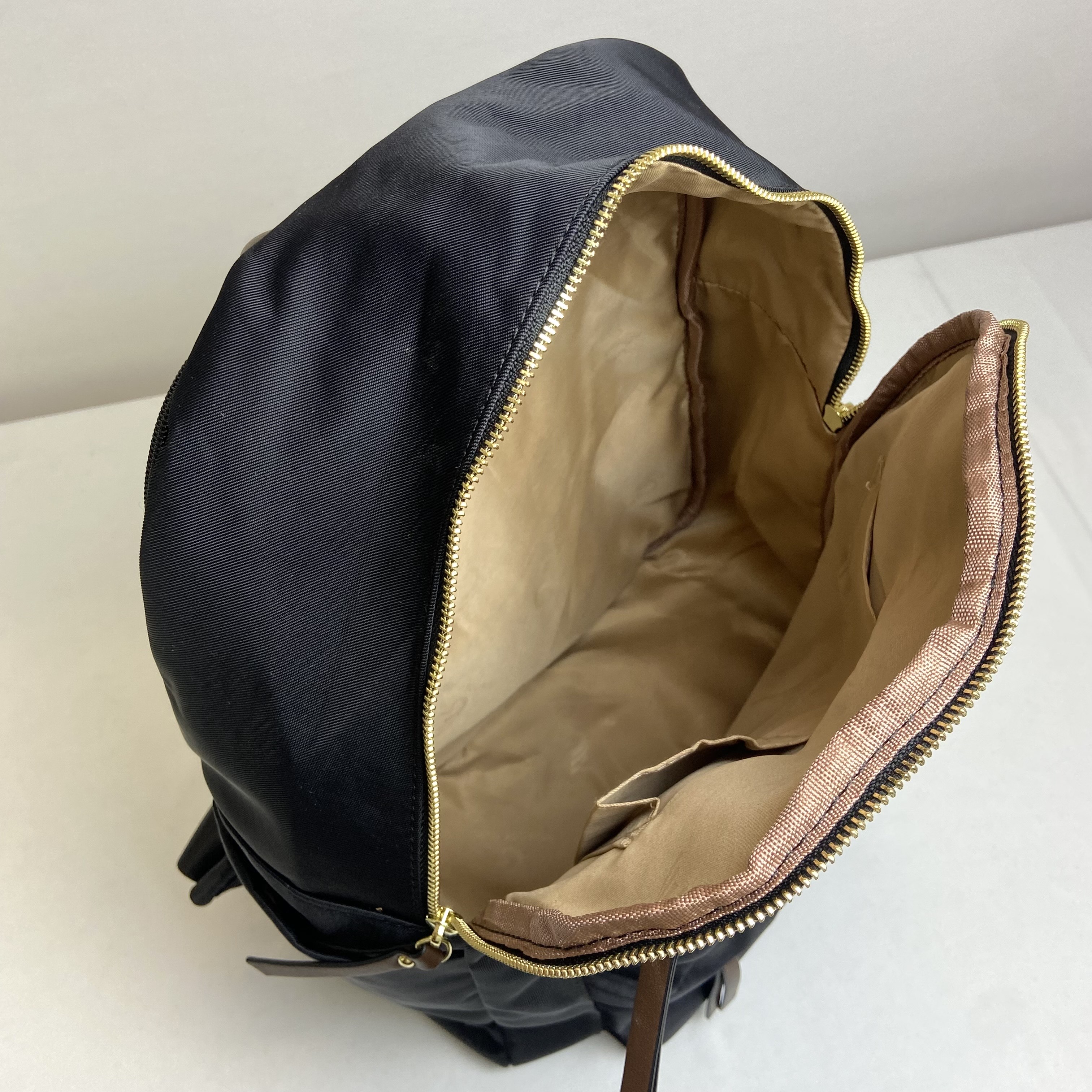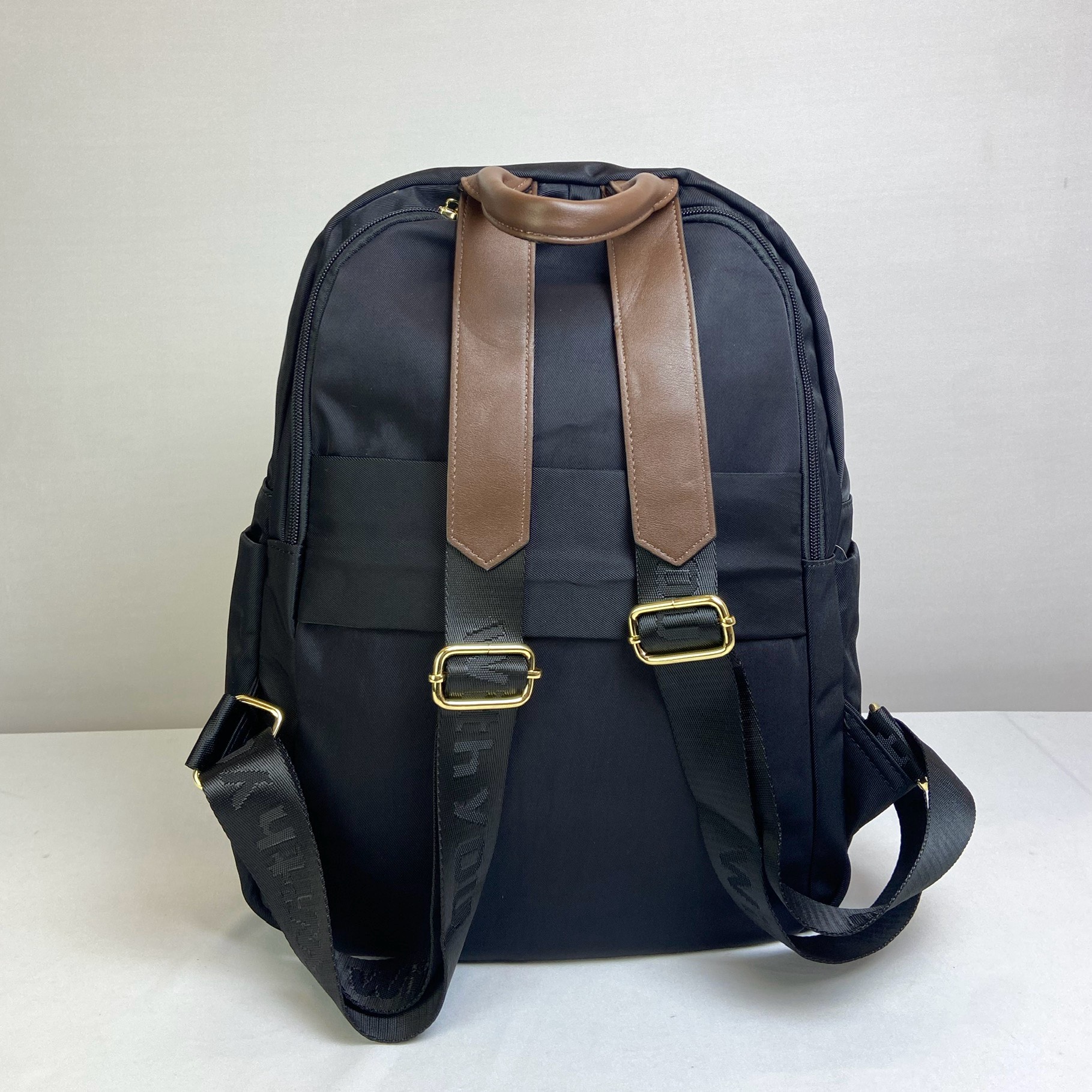 Mochila preta de nylon impermeável, espaçosa e prática, ideal para quem quer unir funcionalidade e estilo. Com um design espaçoso e funcional, ela dispõe de um amplo espaço interno com fechamento em zíper, ideal para manter seus pertences seguros e organizados. Além disso, conta com alça confortável com detalhes marrons, oferecendo um toque sofisticado para a peça. Além disso, a mochila possui dois bolsos dianteiros com fechamento em zíper para itens menores e dois bolsos laterais abertos para acesso rápido. Uma combinação perfeita de resistência, organização e elegância para o seu dia a dia.