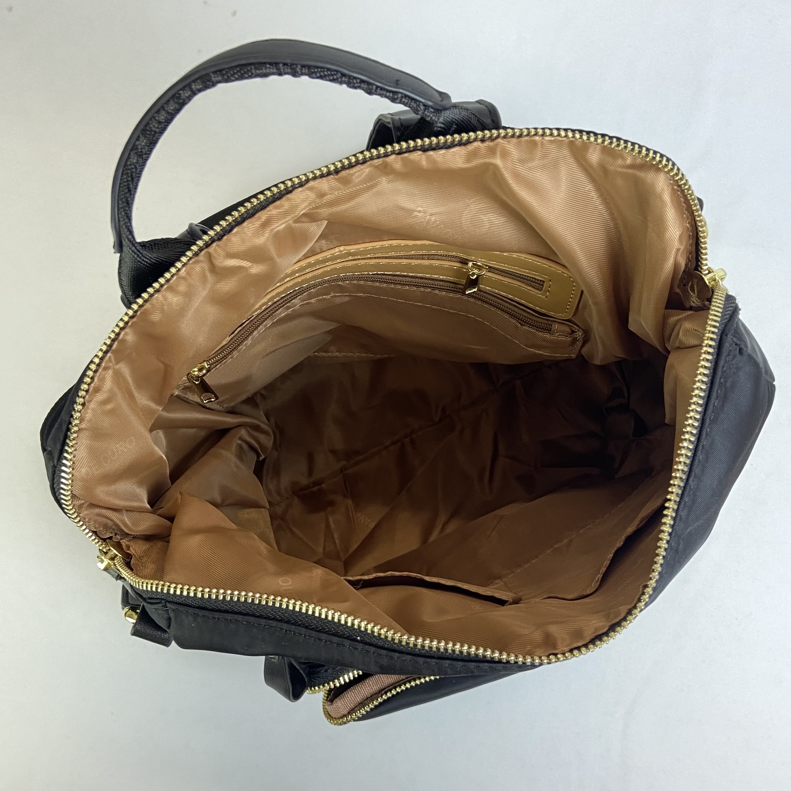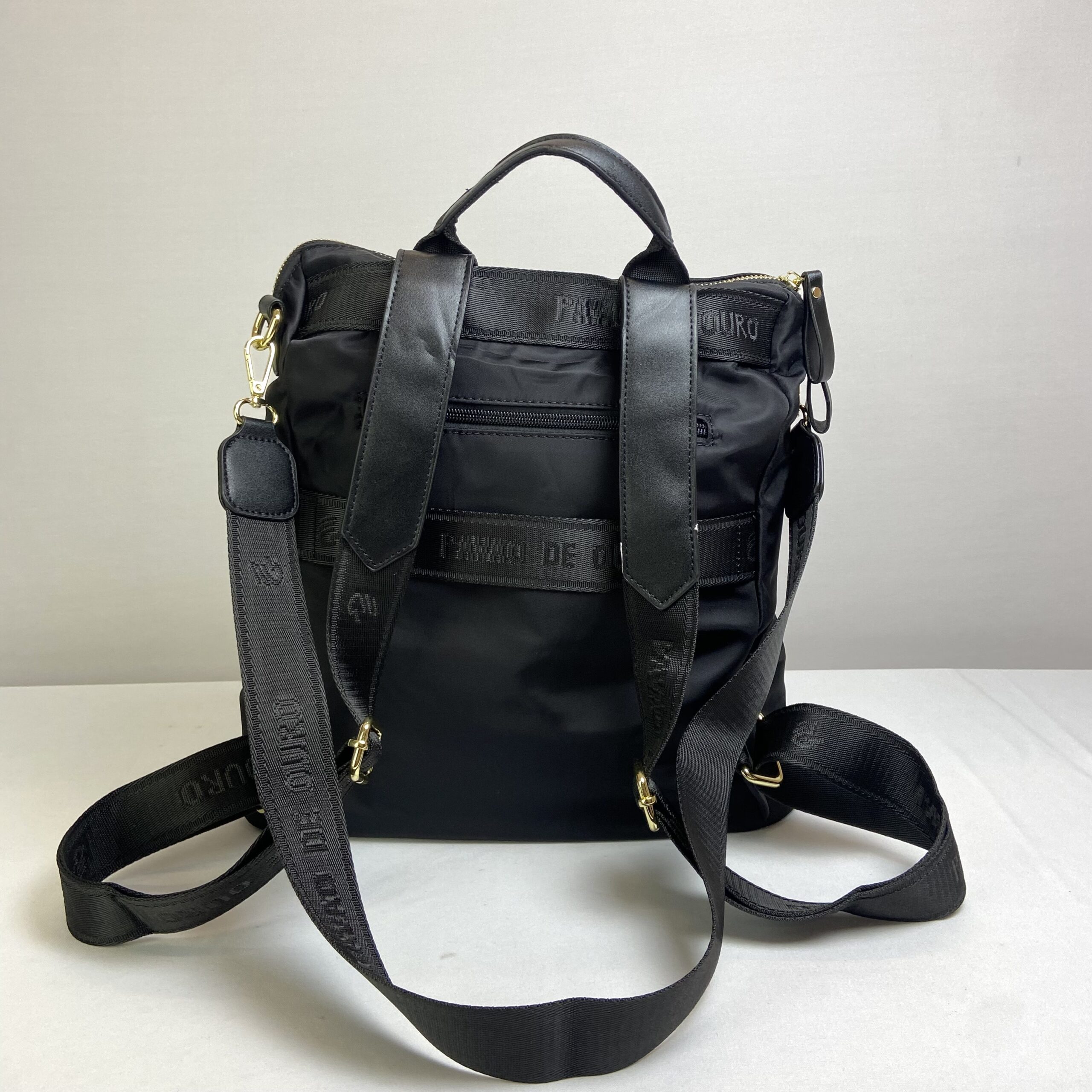 Mochila preta confeccionada em nylon impermeável, combinando design moderno com elegantes detalhes em marrom. Versátil, oferece três opções de alça, de mão, para as costas e uma transversal removível, dessa maneira atende diversas ocasiões. Seu amplo espaço interno com fechamento em zíper, mantêm os itens organizados. Para garantir mais organização, dispõe de dois bolsos dianteiros e um bolso traseiro, todos com fechamento em zíper, além de dois bolsos laterais sem fechamento. Uma escolha prática e estilosa para o dia a dia.