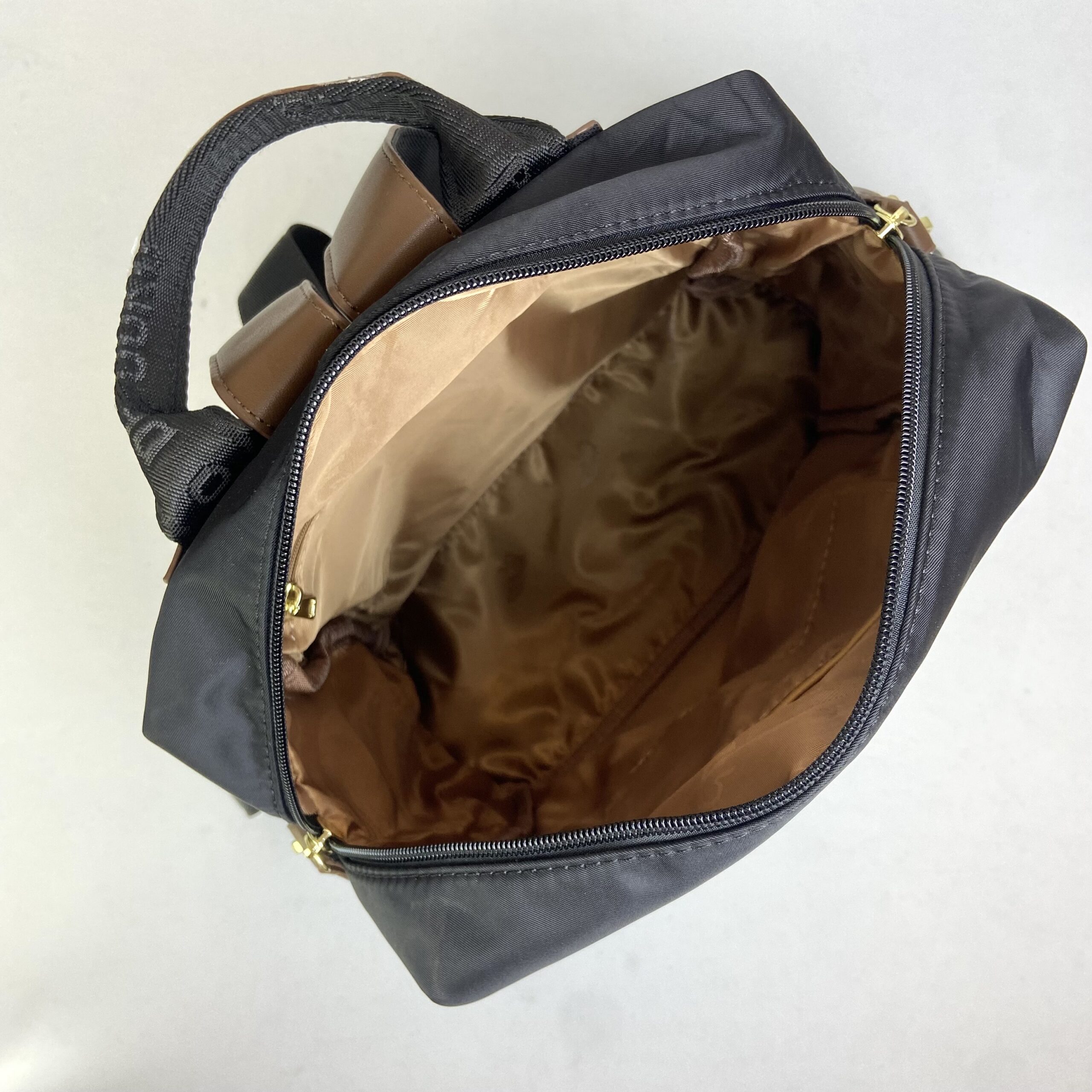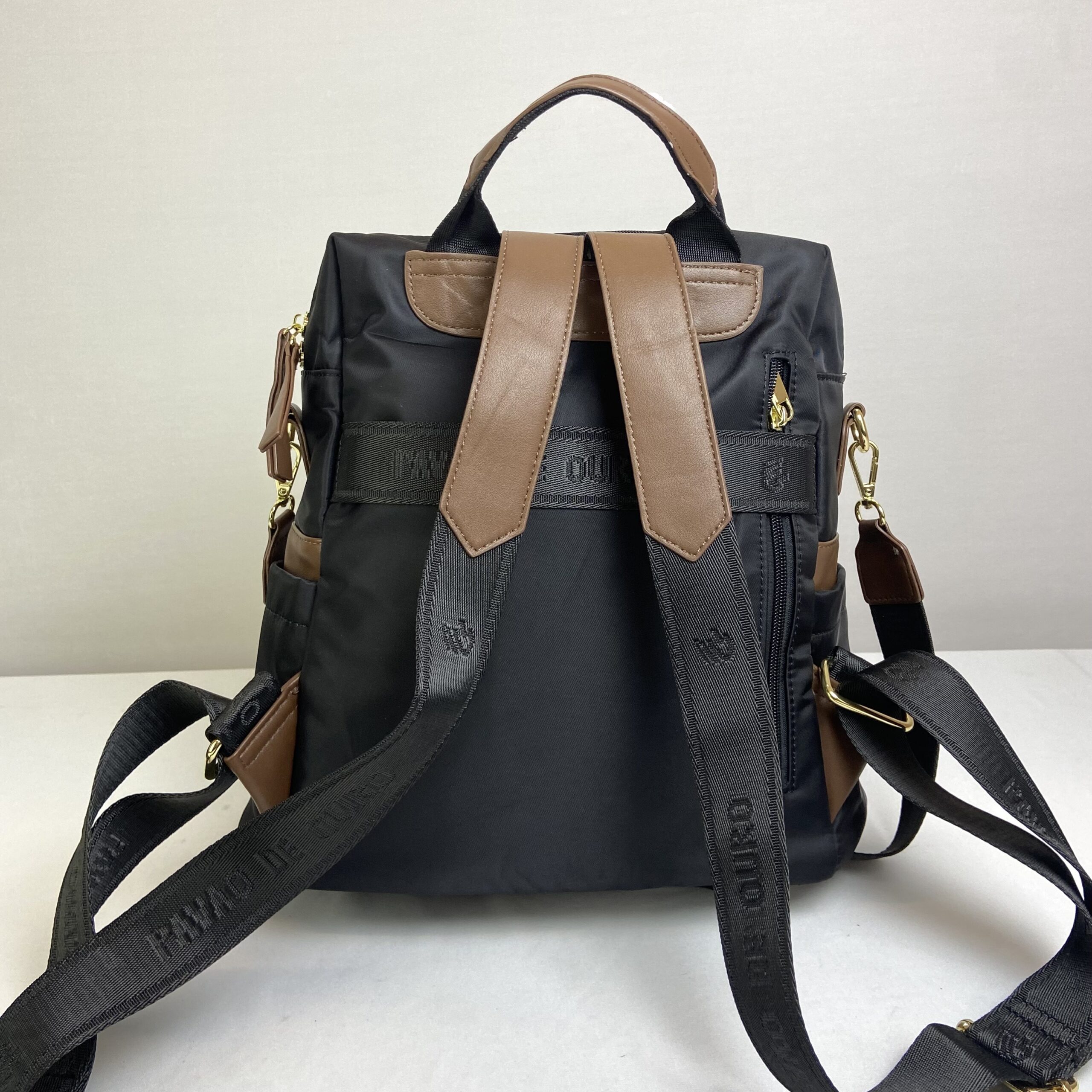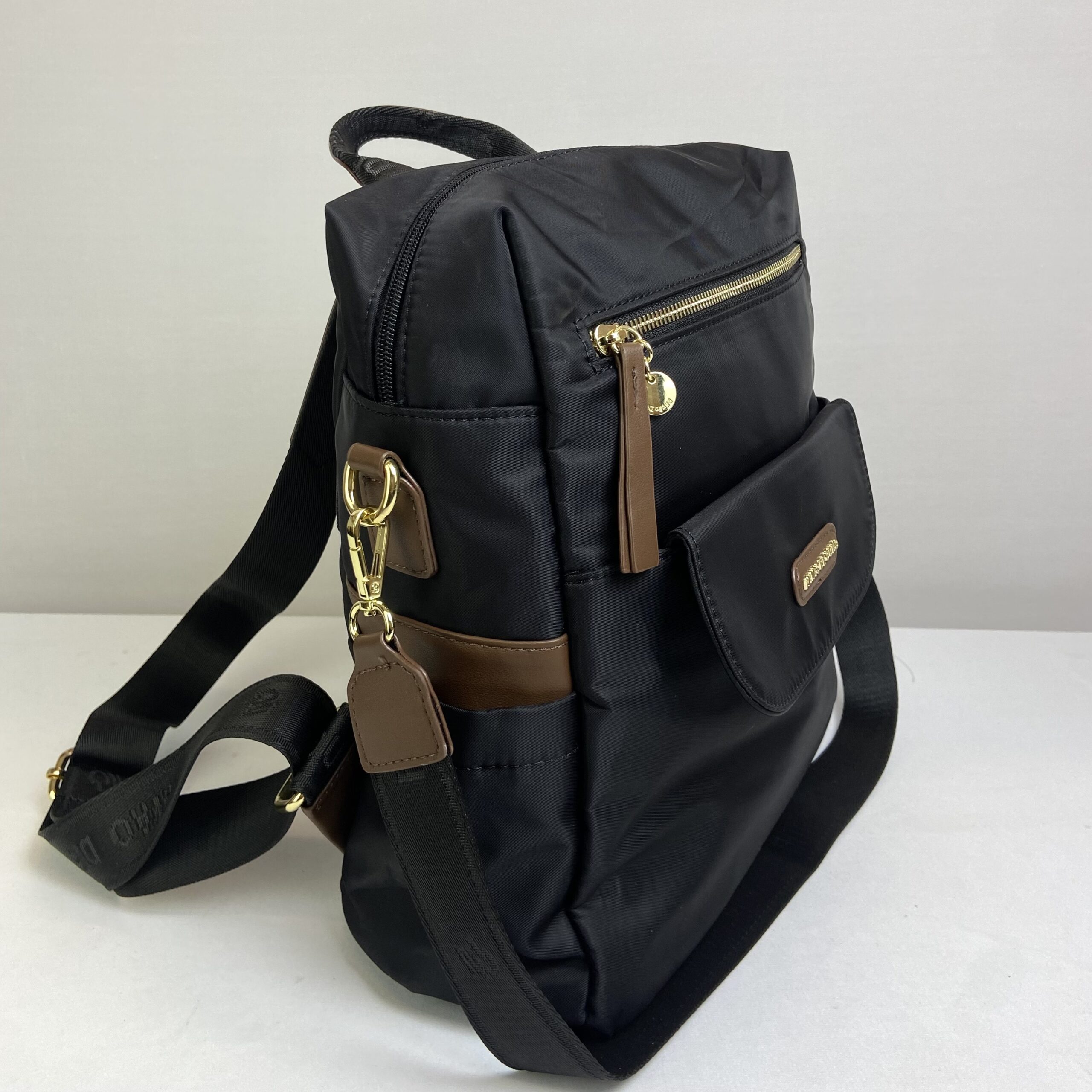 Mochila preta confeccionada em nylon impermeável, combinando design moderno com elegantes detalhes em marrom. Versátil, oferece três opções de alça, de mão, para as costas e uma transversal removível, dessa maneira atende diversas ocasiões. Seu amplo espaço interno com fechamento em zíper, mantêm os itens organizados. Para garantir mais organização, dispõe de dois bolsos dianteiros e um bolso traseiro, todos com fechamento em zíper, além de dois bolsos laterais sem fechamento. Uma escolha prática e estilosa para o dia a dia.